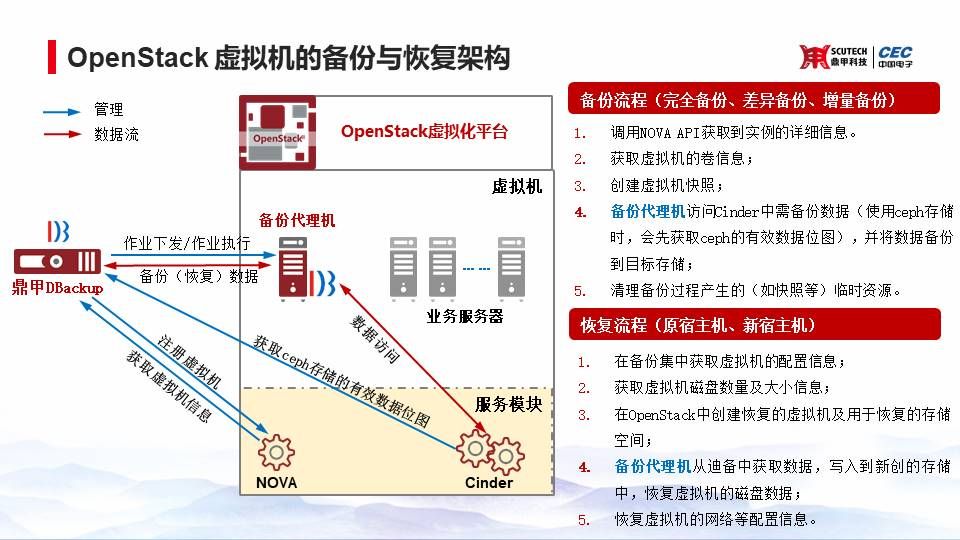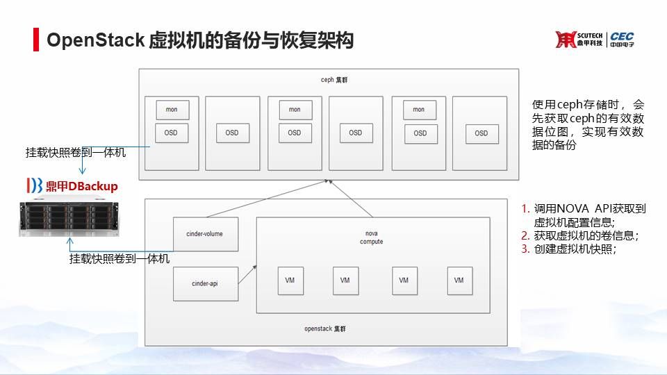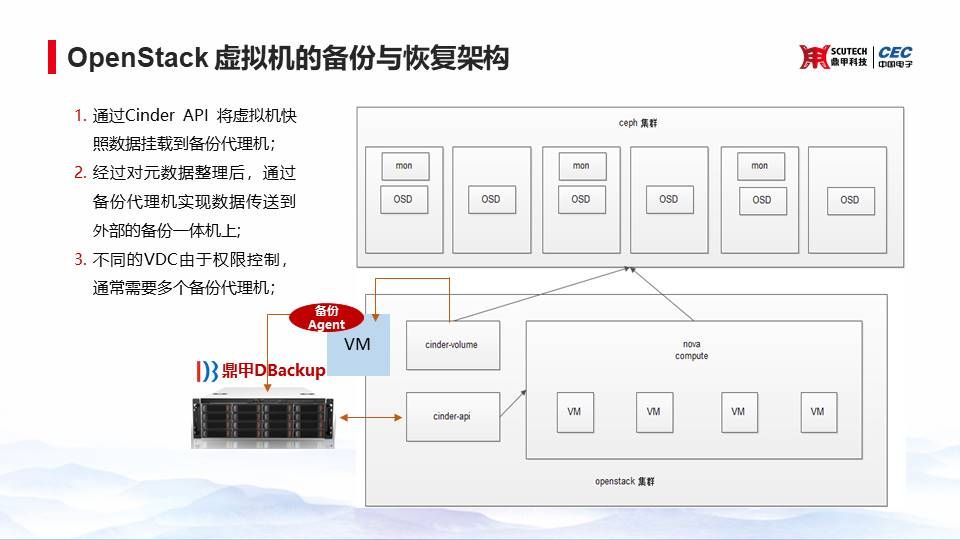 對OpenStack來說,其實和備份真正打交道的就幾個部分。第一個核心組件,是NOVA,它是記錄整個OpenStack虛擬機的配置和管理信息的,第二塊是cinder,它是管理數據存儲對象的,我們的虛擬機實際上就是通過cinder來進行存儲的。