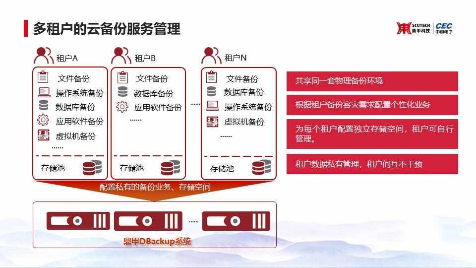 這個是我們多租戶的云備份服務管理。我們共享同一套物理備份環境,每個租戶可以根據自己的備份容災需求,配置個性化業務。鼎甲為每個租戶配置獨立存儲空間,租戶可自行管理,且租戶數據私有管理,租戶間互不干預。