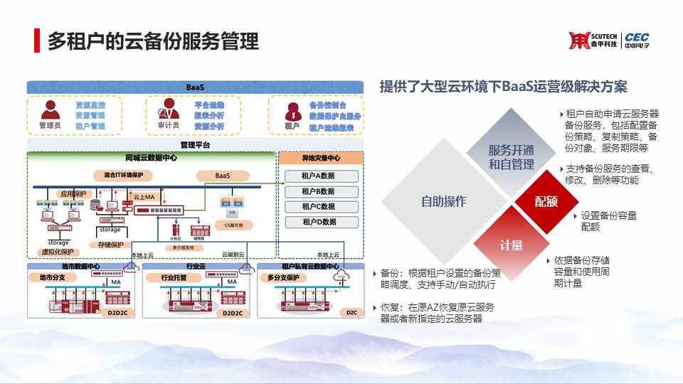 對于多租戶的云備份服務管理,不僅僅是我們剛才演示的這些功能,實際上它核心是包含4個主體架構的。如果要實現BaaS這種運營級的云備份服務的話,你就要有服務開通和自管理,自助的操作,配額的管理,還有計費和相關的計量。