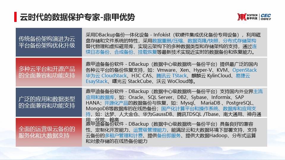 我們鼎甲的優勢主要可以分為四個部分:一是傳統備份架構演進為云平臺備份架構優化升級;二是多種云平臺和開源產品的全面兼容和功能支持;三是廣泛的應用和數據類型的全面兼容和功能支持;最后就是全面的運營級云備份的服務化和大數據支持。