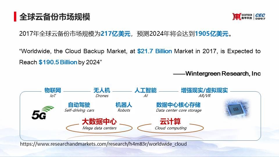 據國外研究機構顯示,2017年全球云備份市場規模為217億美元,預測2024年將會達到1905億美元,我們可以看到這個增長是非常之迅猛的。
