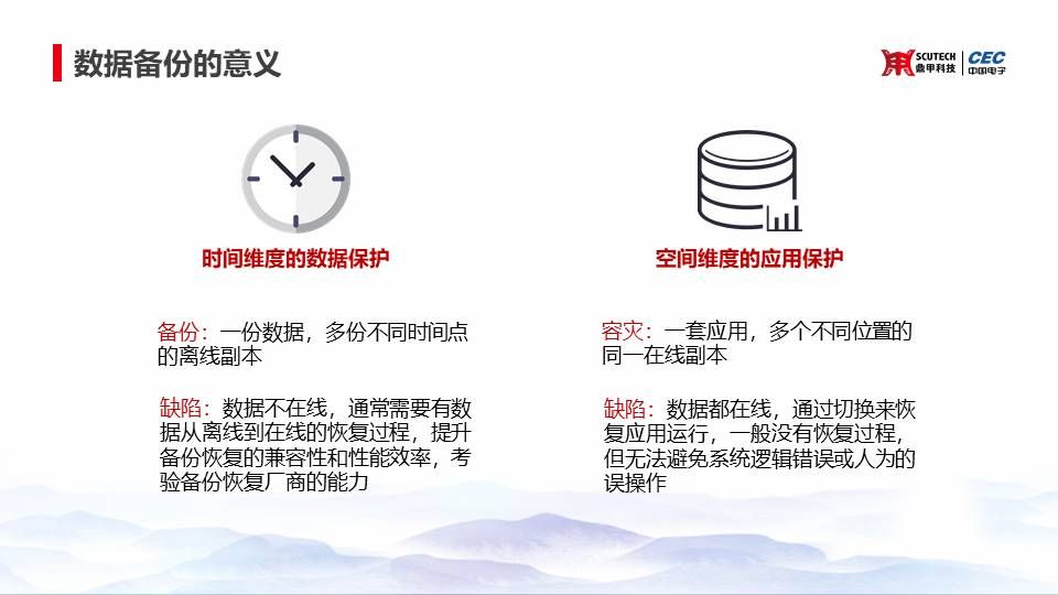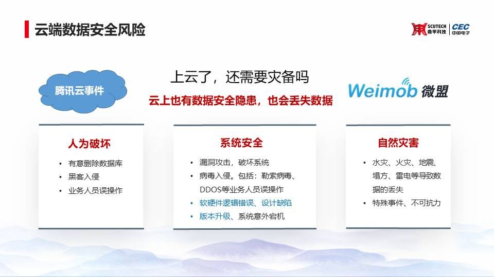 現在眾多企業紛紛上云,而云上也是存在著數據安全隱患,騰訊云和微盟刪庫跑路事件就是例子。在這里我還是想強調一下,實際上備份一直是數據保護領域,或者說是容災備份領域,最可靠、最保險的一種數據保護技術。