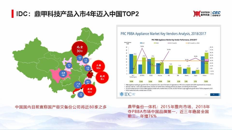 目前國內做國產容災備份公司將近80家之多,主要以北上廣為主,而在眾多廠商中,鼎甲的表現是最突出的。據IDC報告顯示,鼎甲2018年奪PBBA市場中國品牌第一,且近三年穩居全國前三,年增76%。