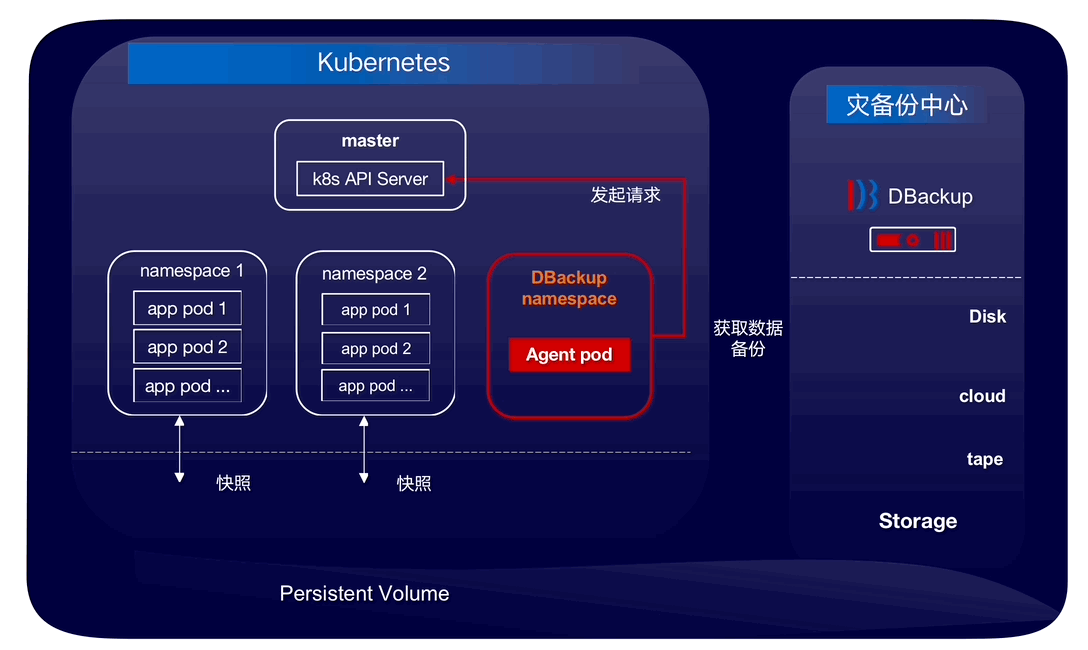 新版 DBackup 推出以應(yīng)用為中心的 Kubernetes 數(shù)據(jù)保護(hù)方案,采用云原生非侵入式部署方式,支持 K8S 應(yīng)用(Namespace、Workloads)和數(shù)據(jù)的一致性備份和恢復(fù),為混合、多云環(huán)境提供企業(yè)級保護(hù)。