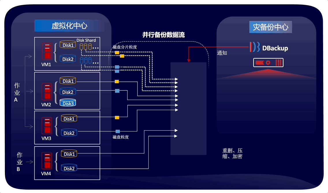 DBackup 新版統(tǒng)一了虛擬化智能并行處理框架,多作業(yè)支持多備份主機(jī)同時,用戶還可通過宿主機(jī)、虛擬機(jī)、虛擬磁盤、磁盤分片等多層面合理分配并行備份資源,特別適用于大規(guī)模虛擬化場景,有效平衡資源工作負(fù)載,提升備份恢復(fù)性能。
