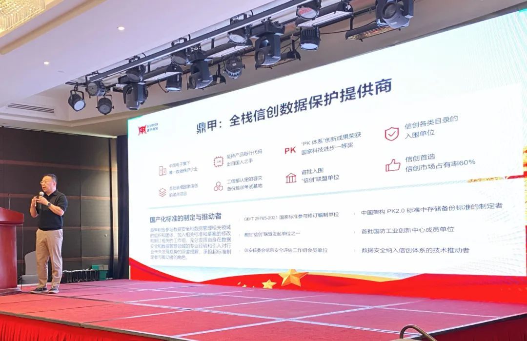 鼎甲全國技術總監湯毅圍繞“全棧信創災備產品體系”展開分享,重點介紹了鼎甲的兩大核心產品線:迪備和安備。他指出,鼎甲依托完全自主研發的架構體系,在分布式重刪、開放式對接、云原生支持等技術上持續突破,形成覆蓋主機、虛擬化、數據庫、云環境和終端的“全棧備份”產品矩陣,透過先進的流式備份技術,幫助客戶真正實現無中轉、無緩存、無代理的高效數據保護能力,全面適配信創軟硬件生態。